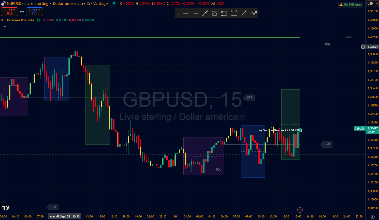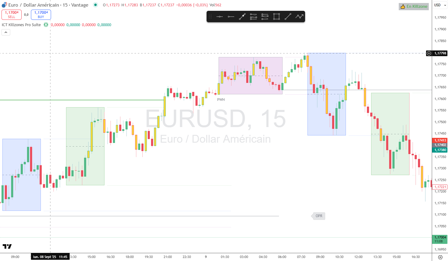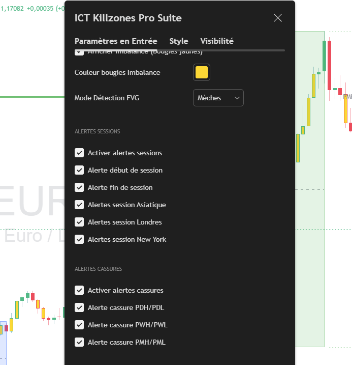 An ICT/SMC (Smart Money Concepts) indicator is a tool that automates the display of trading concepts popularized by the ICT method: kill zones, key levels, imbalances, liquidity zones, etc.